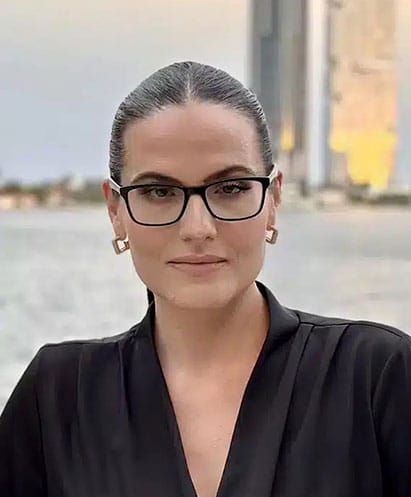 Person wearing glasses and a black shirt with water and buildings in the background.